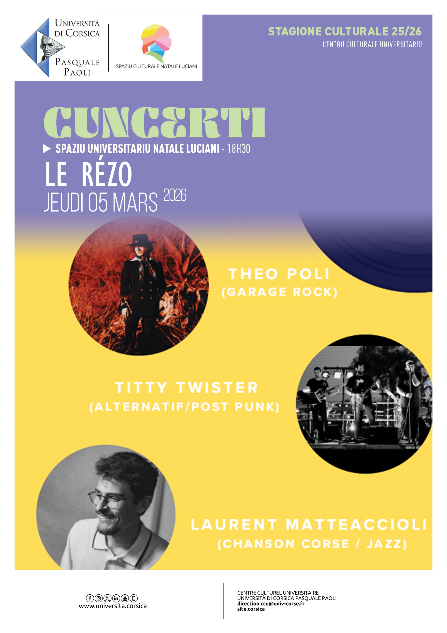 Jeudi 05 mars 2026 à 18h30 Le Rézo soutient depuis 2008 la création musicale émergente en Corse, toutes esthétiques confondues, à travers différentes actions d’accompagnement : conseil, formation, résidences, aide à la production et à la diffusion. Retrouvez sur scène ce jeudi : Théo Poli (garage rock), Titty Twister (alternative punk), et Laurent Matteaccioli (chanson corse / jazz) |
