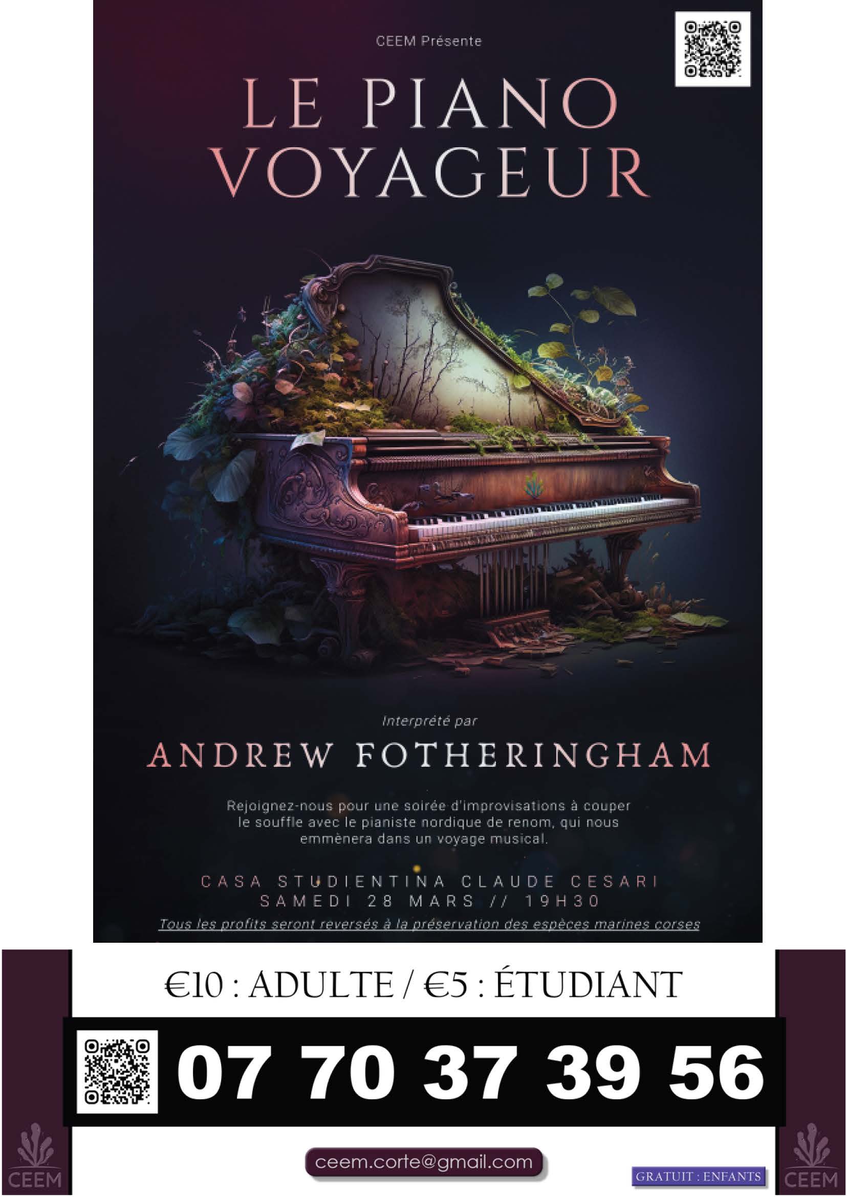 Le CEEM (Cercle des Étudiants en Écologie Méditerranéenne) a le plaisir d'organiser un concert de piano intitulé « Le Piano Voyageur », le vendredi 28 mars 2026 de 19h30 à 21h30, à la Casa Studientina Claude Cesari de Corte. Le concert sera donné par Andrew Fotheringham, étudiant norvégien au talent remarquable, qui proposera au public un voyage musical autour des thèmes qui nous sont chers : les animaux, la mer et l'environnement. Informations pratiques : |