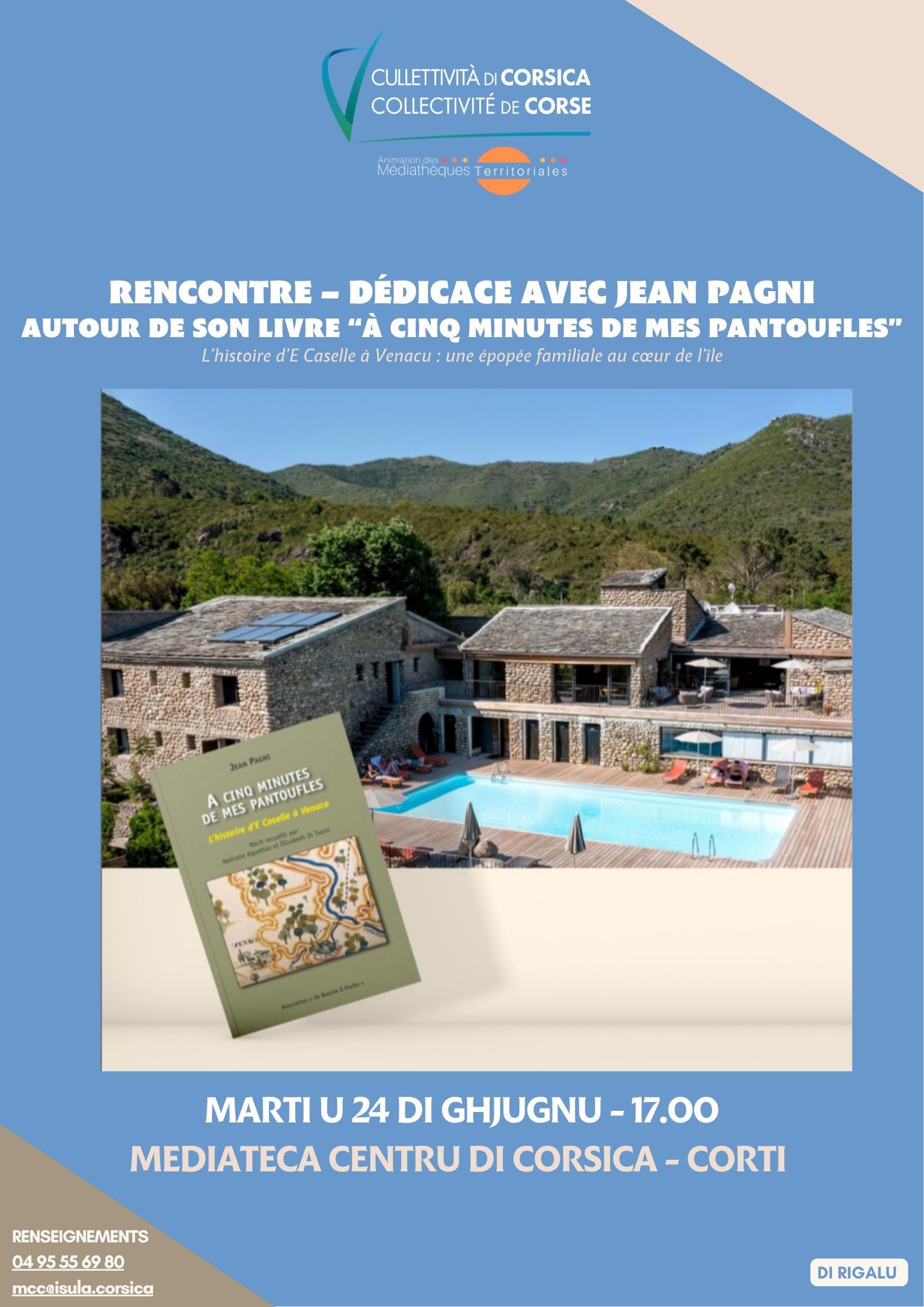 Rencontre avec Jean Pagni pour son ouvrage : À cinq minutes de mes pantoufles – L’histoire des Caselle à Venaco Le 24/06/2025 à 17:00 Médiathèque territoriale CENTRE CORSE, Adulte Nous vous invitons à une rencontre-dédicace autour du livre À cinq minutes de mes pantoufles – L’histoire des Caselle à Venaco , un recueil de témoignages de Jean Pagni, figure emblématique et fondateur de l’établissement E Caselle à Venaco. Une belle occasion de découvrir une histoire humaine, enracinée dans un territoire et portée par la passion d’un homme.