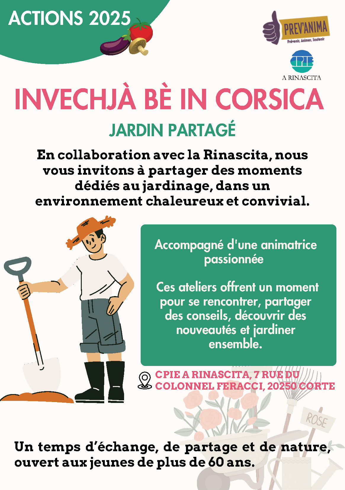 Dans le cadre de l’appel à projet « Invechjà bè in Corsica », le CPIE A Rinascita organise avec l'association Prev’anima, le 6 novembre de 14h30 à 16h30, un atelier "Préparer son jardin pour l'hiver", pour les plus de 60 ans, au jardin pédagogique San Francescu (arrière-cour du 7 rue colonel Feracci).